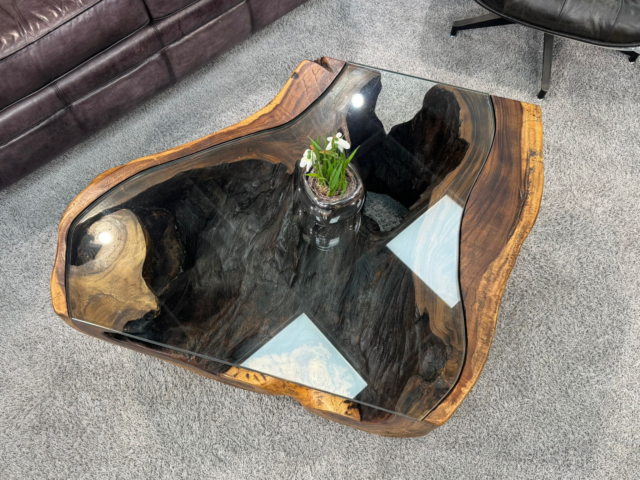 Soll es ein ovaler Couchtisch sein? Dann bist du jetzt fündig geworden. Dieser Tisch ist kein Massenprodukt, sondern ein echtes Unikat – aus einer einzigen Baumscheibe (Baumstamm) gefertigt, sorgfältig in Handarbeit veredelt und mit einem unverwechselbaren Glasdetail versehen.