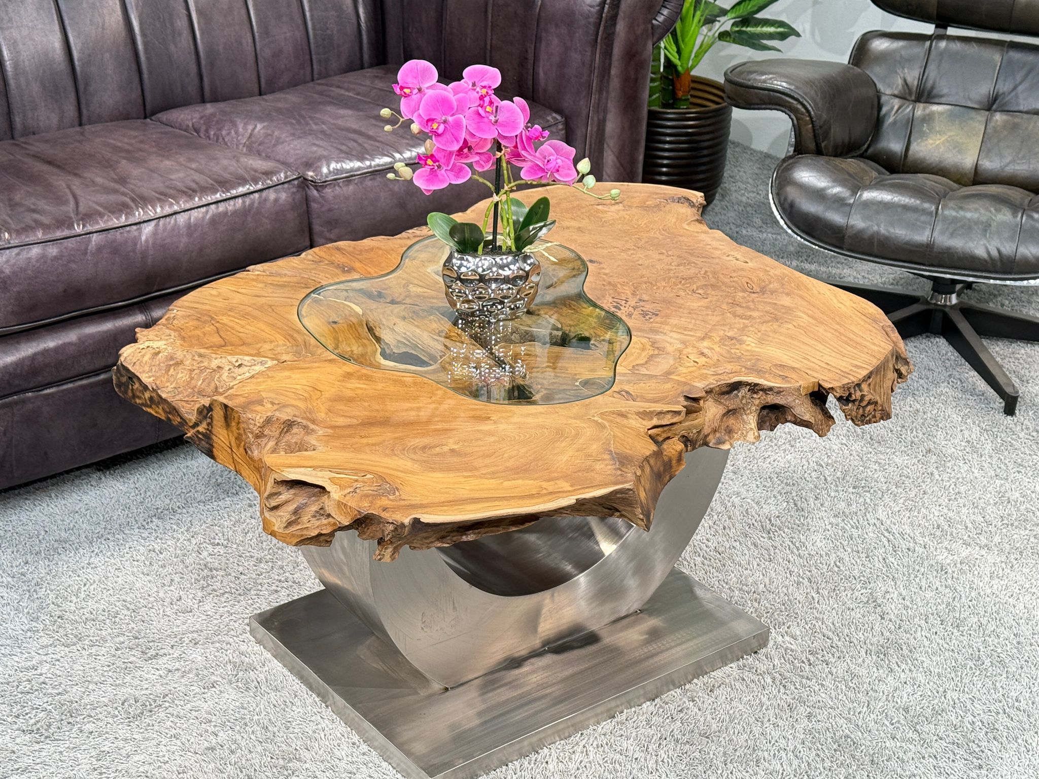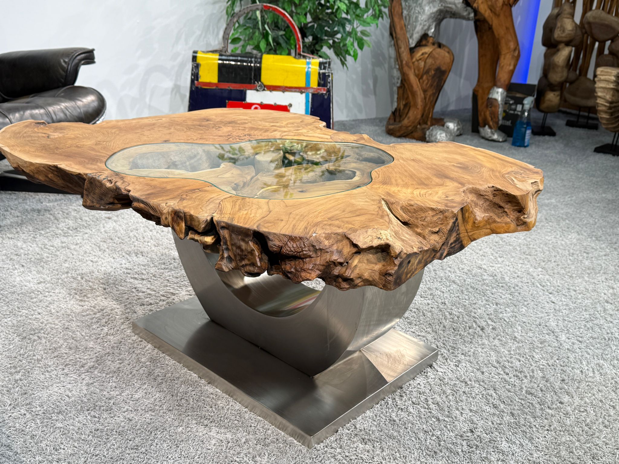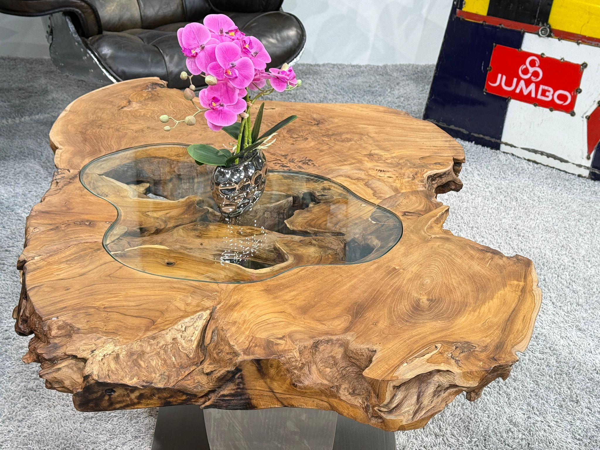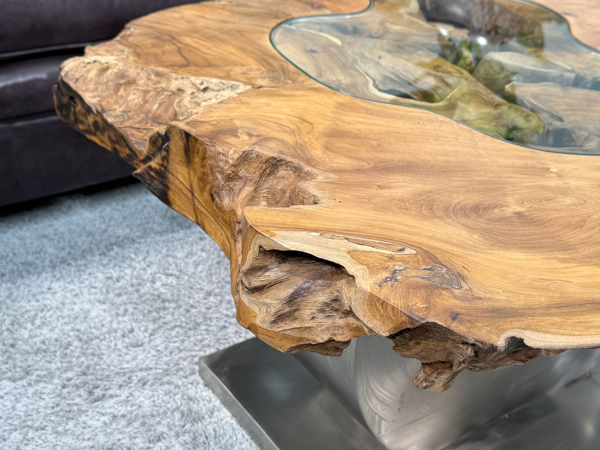 Das Wohnzimmertisch Unikat aus einem Baumstamm aus der Serie Expression ist ein außergewöhnliches Möbelstück, das natürliche Eleganz und handwerkliche Perfektion in sich vereint. Die Tischplatte wurde aus verleimten Baumscheiben eines Teakbaumes gefertigt, die aus dem Wurzelbereich stammen. Diese besondere Holzherkunft verleiht dem Tisch seine ausdrucksstarke Struktur und macht ihn zu einem echten Unikat.