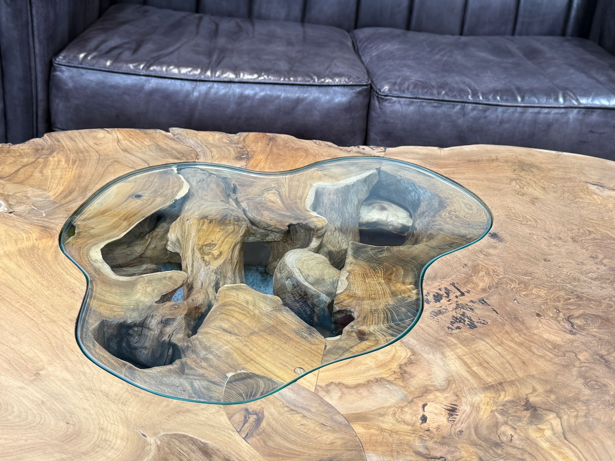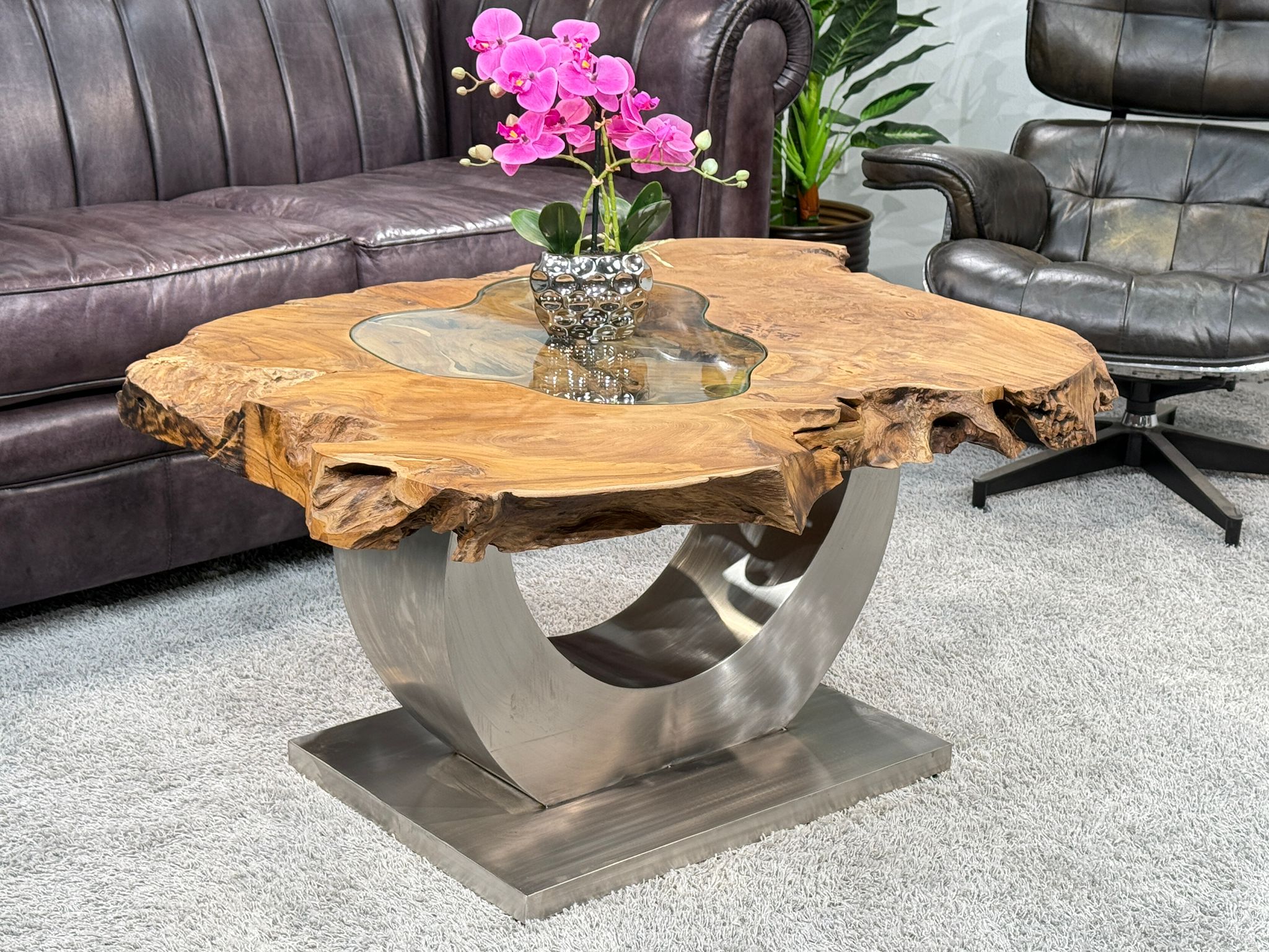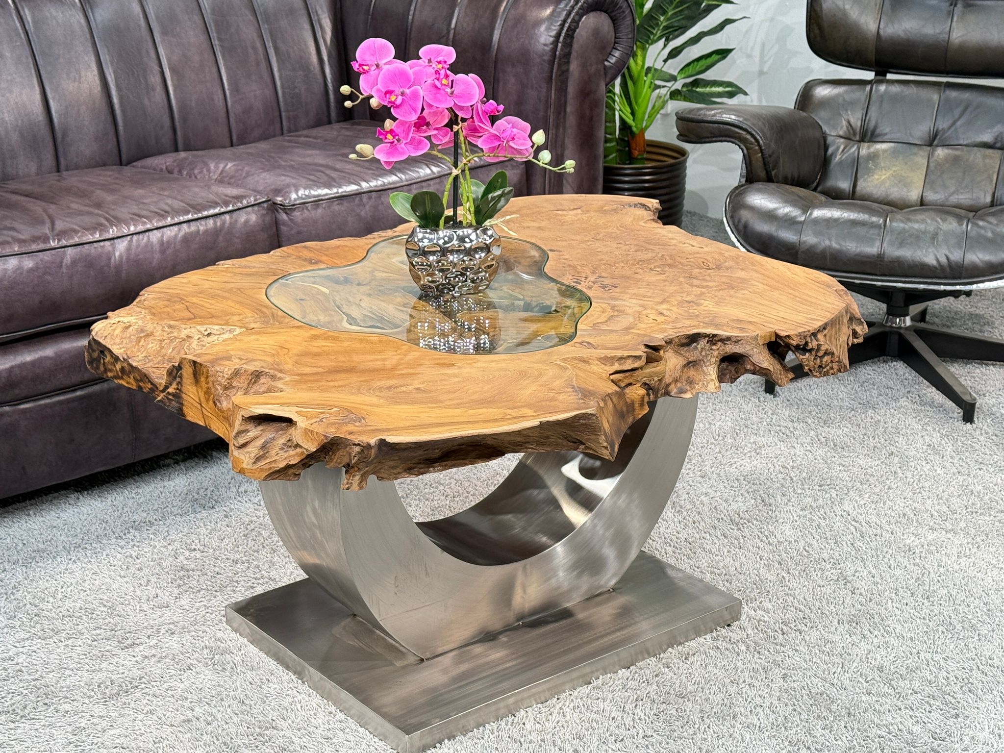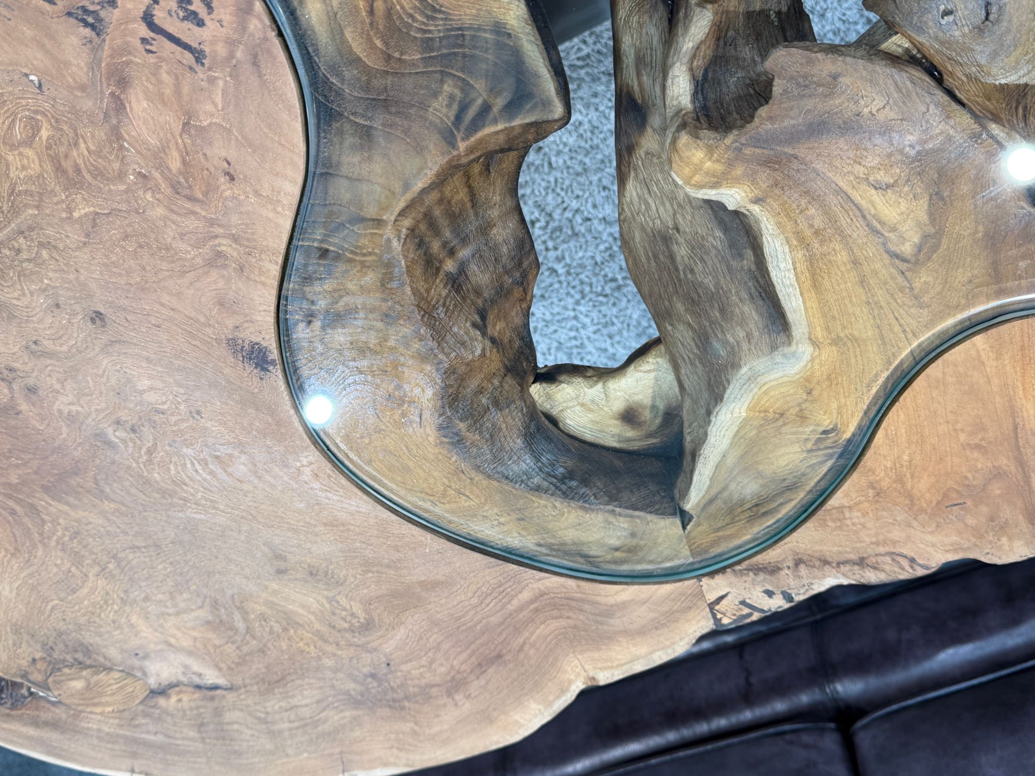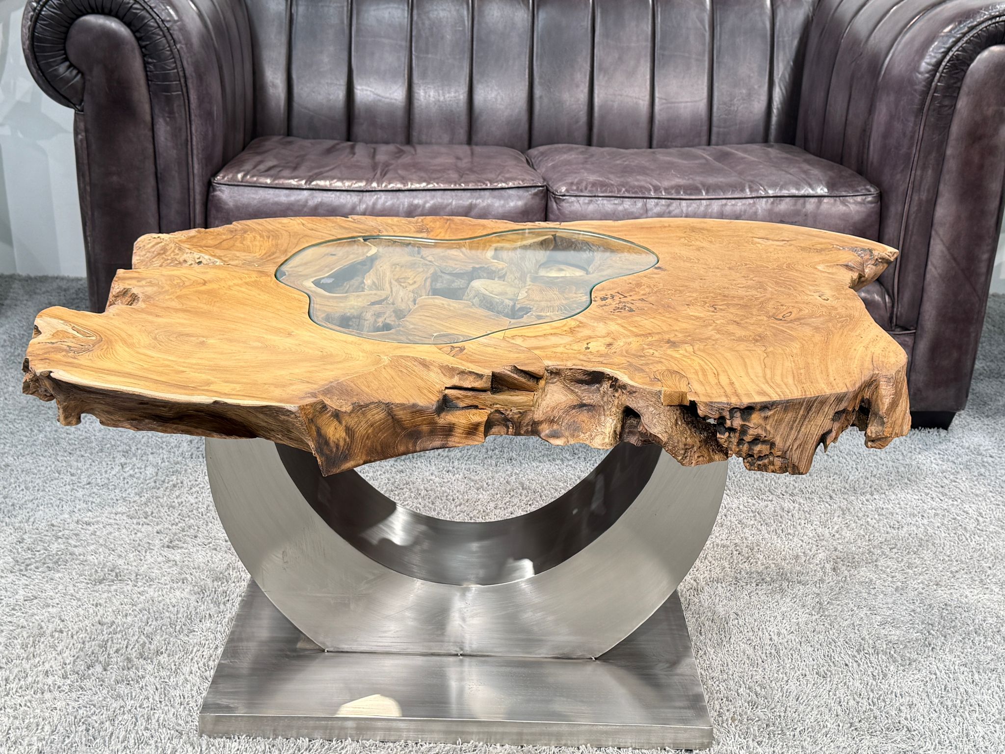 Das Wohnzimmertisch Unikat aus einem Baumstamm aus der Serie Expression ist ein außergewöhnliches Möbelstück, das natürliche Eleganz und handwerkliche Perfektion in sich vereint. Die Tischplatte wurde aus verleimten Baumscheiben eines Teakbaumes gefertigt, die aus dem Wurzelbereich stammen. Diese besondere Holzherkunft verleiht dem Tisch seine ausdrucksstarke Struktur und macht ihn zu einem echten Unikat.