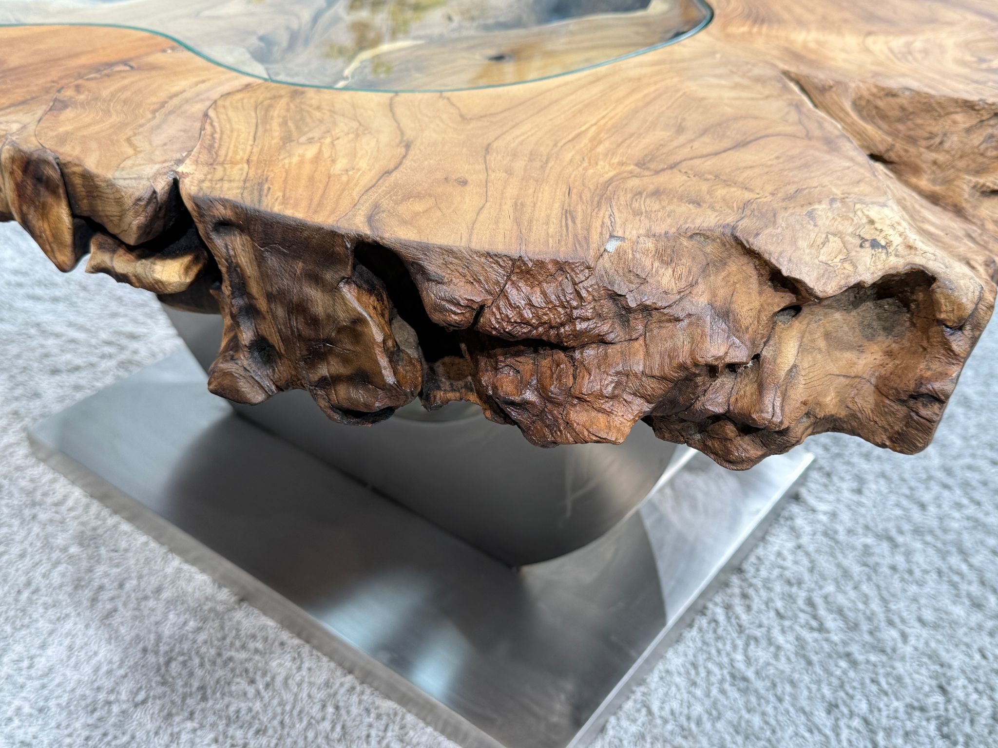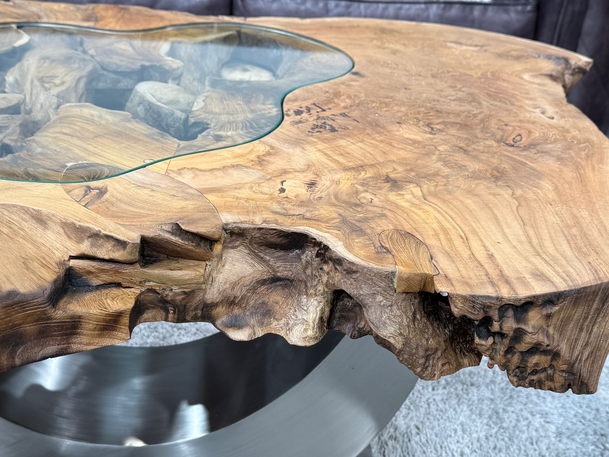 Die natürlichen Baumkanten wurden an den Außen- und Innenbereichen der Tischplatte sorgfältig erhalten, wodurch die ursprüngliche Form des Holzes sichtbar bleibt. Der entstandene freie Innenraum wurde in reiner Handarbeit mit einer hochwertigen Glaseinlage verziert, die die Details des Holzes betont. Die massive Tischplatte hat eine beeindruckende Stärke von 7,5 cm, wurde fein geschliffen und mit einem schützenden Wachs versiegelt, um die natürliche Schönheit des Holzes hervorzuheben.