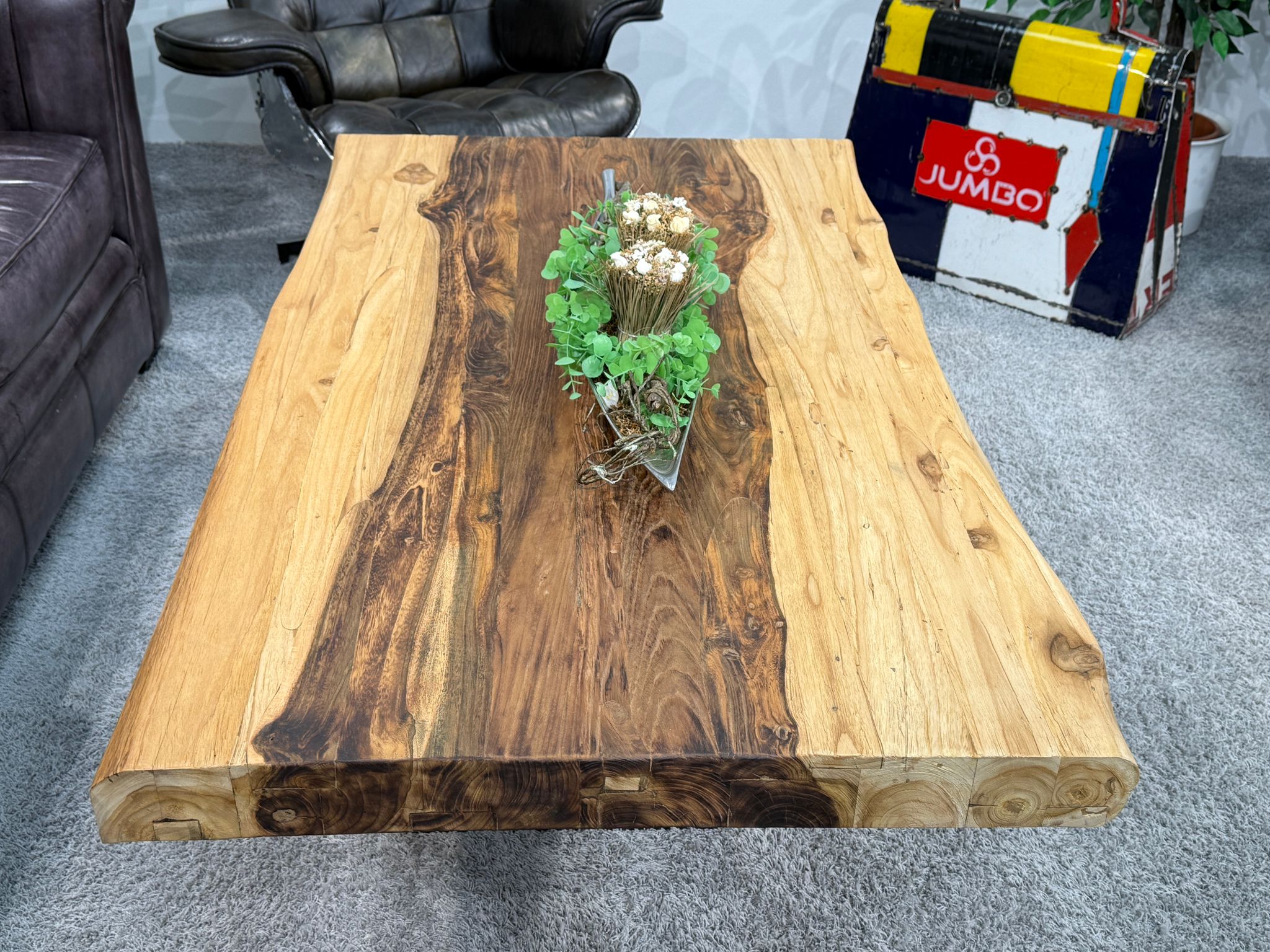 Jeder Wohnzimmertisch aus Massivholz dieser Serie wird in Handarbeit gefertigt – vom Holzschnitt über die Oberflächenveredelung bis zum letzten Schliff am Rohstahlgestell. Das verwendete Teakholz stammt aus rückgebauten Gebäuden und verleiht jedem Möbelstück eine authentische Ausstrahlung.