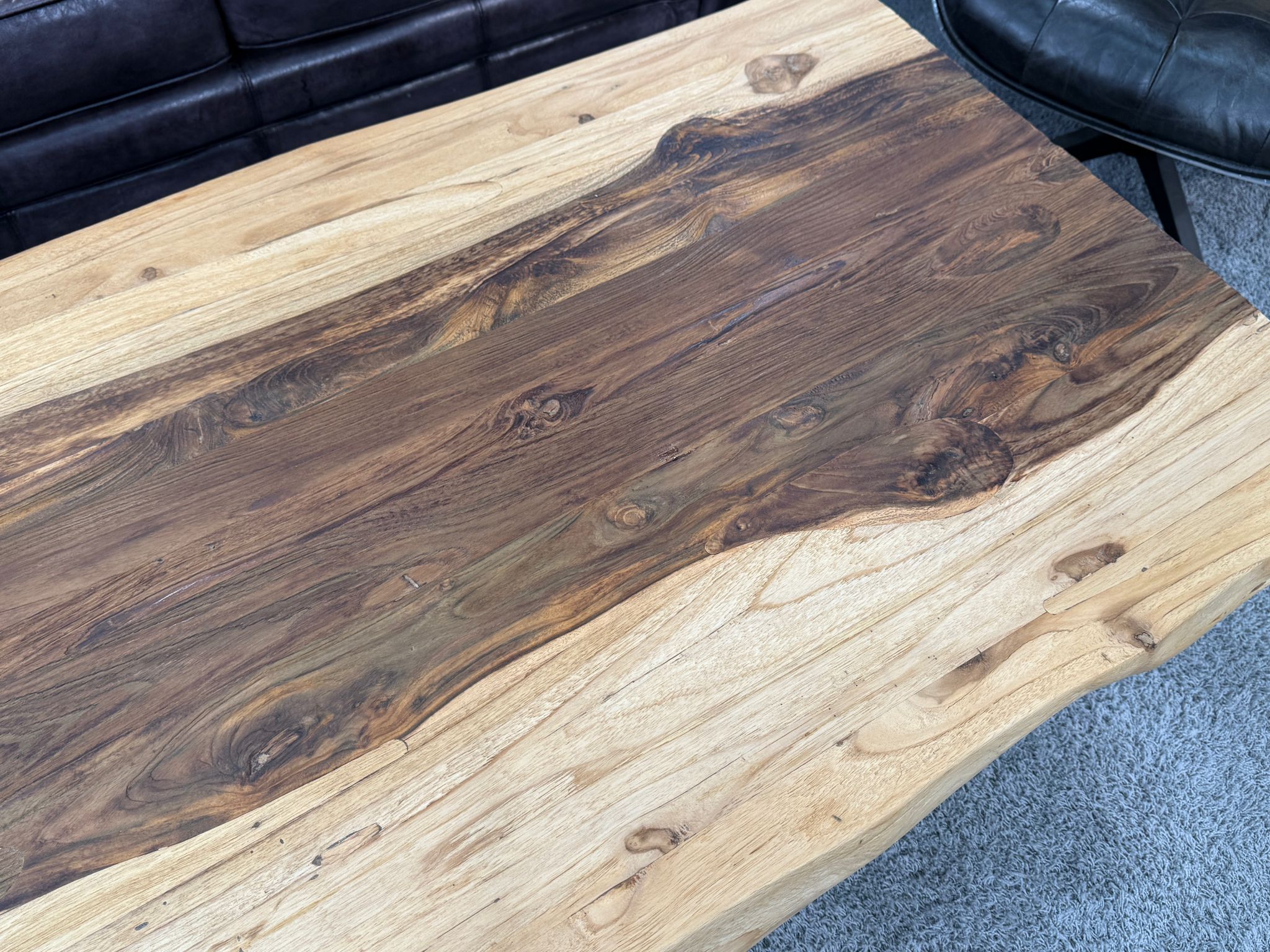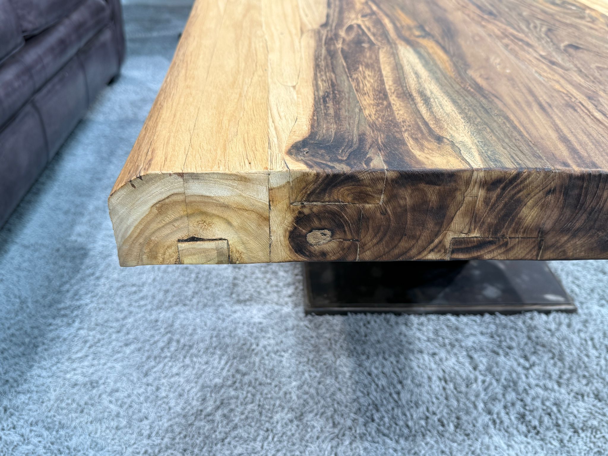 Die Tischplatte ist durchgehend vollmassiv und beeindruckt mit einer Stärke von ca. 8 cm – keine Aufdopplung, sondern echtes Material. Die Oberfläche wurde aufwendig von Hand gebürstet, um die natürliche Haptik hervorzuheben, und mit hochwertigem Möbelwachs versiegelt. Getragen wird die massive Platte von einem handgefertigten Gestell aus Rohstahl in X-Form, das für Stabilität und einen industriellen Look sorgt.