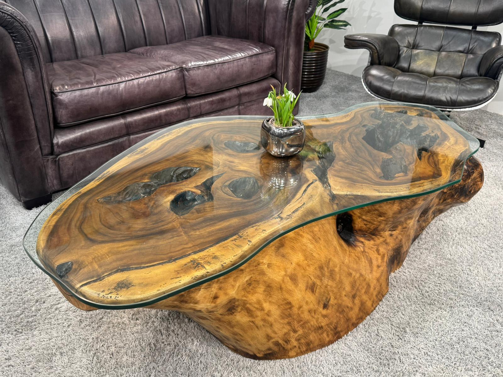 Durch die organische Form der Baumscheibe in Kombination mit der klaren, geometrischen Kante der Glasplatte passt dieser Tisch hervorragend in große Wohnlandschaften. Er bricht die strengen Linien einer modernen Couchgarnitur auf und bringt Wärme in den Raum, ohne durch das Glas an Modernität zu verlieren. Ein idealer Begleiter für alle, die das Besondere suchen.