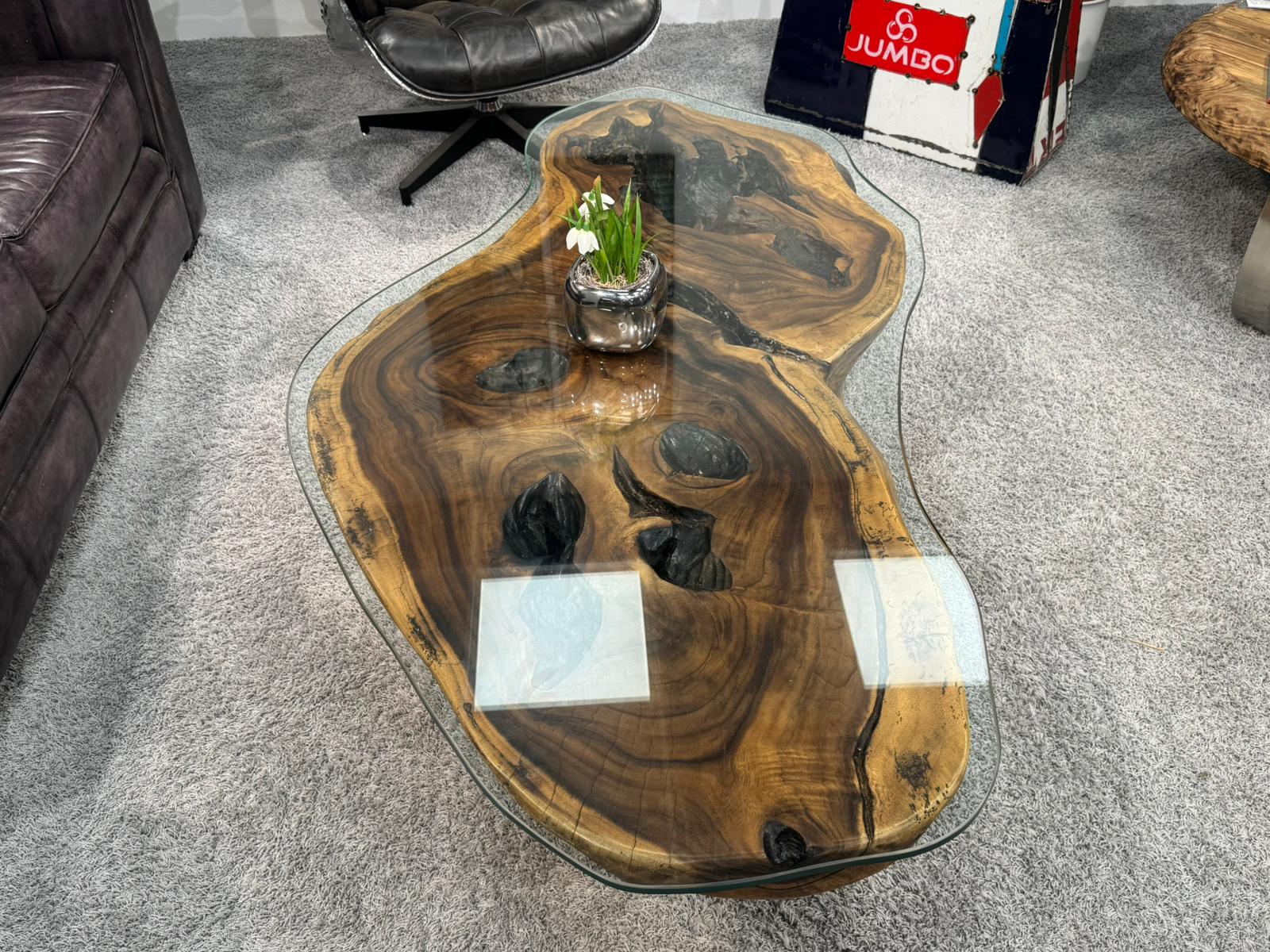 Das besondere Highlight dieses Modells ist die großflächige Glasplatte, die den massiven Holzkern krönt. Anders als bei herkömmlichen Modellen mit kleinen Glaseinlegern, dominiert hier eine großzügige Glasfläche das Design. Sie schützt das edle Holz nicht nur, sondern gewährt einen unverstellten Panoramablick auf die wilde Maserung, die Jahresringe und die einzigartigen Verwachsungen der Baumscheibe darunter. Es entsteht der Eindruck, als würde man durch eine klare Wasseroberfläche auf den Grund eines Sees blicken.