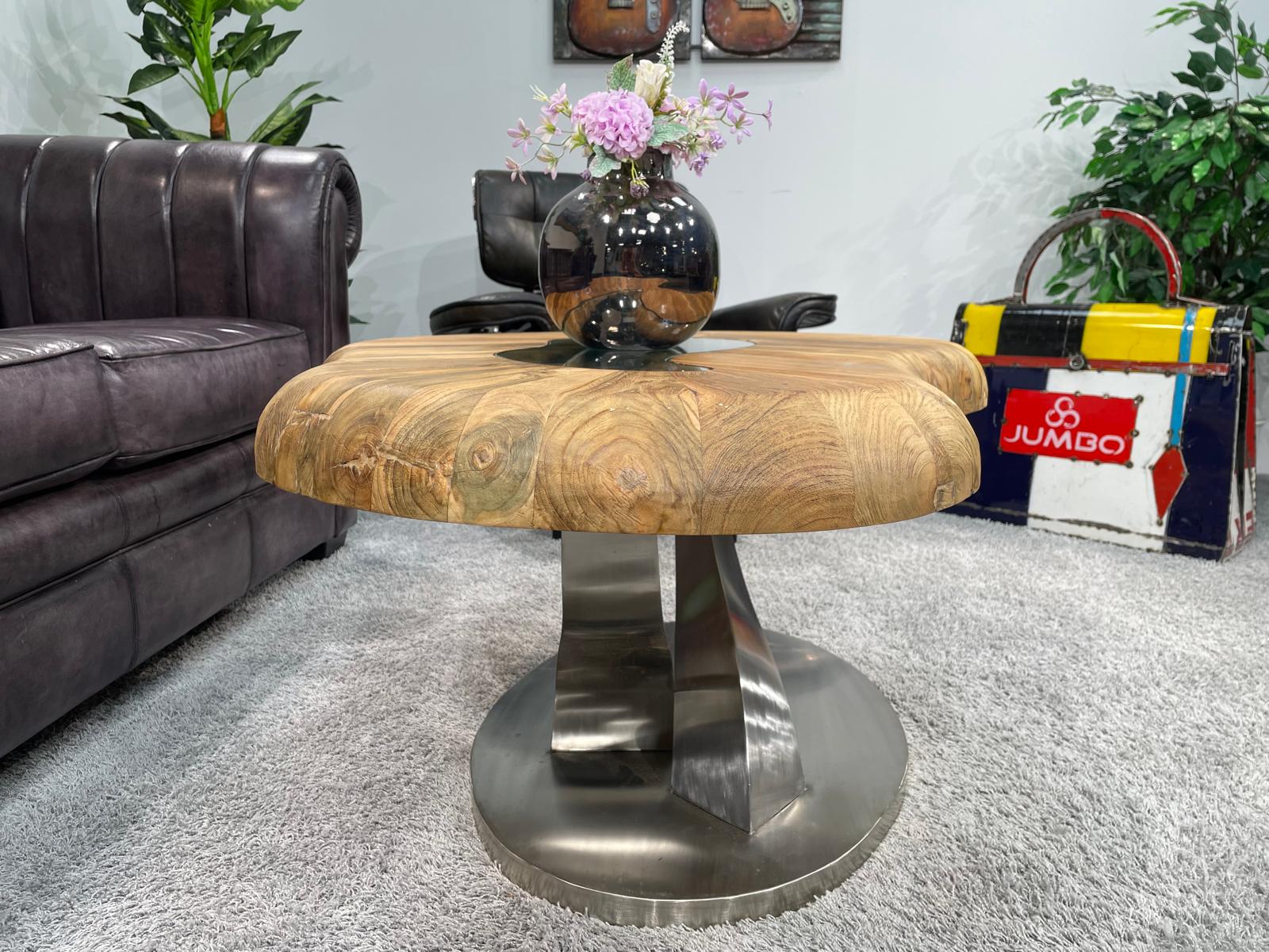The coffee table is supported by a stainless steel base with branch-like struts made of brushed stainless steel. This not only provides stability but also a modern and unique appearance. This element was also crafted with elaborate handwork and integrates seamlessly into the overall design.