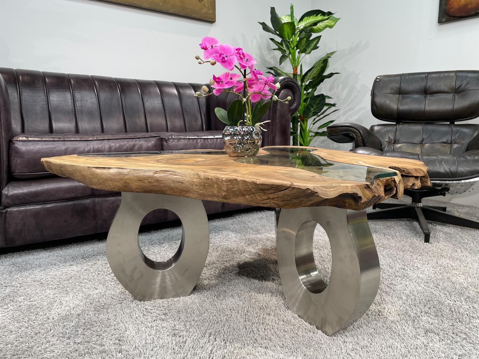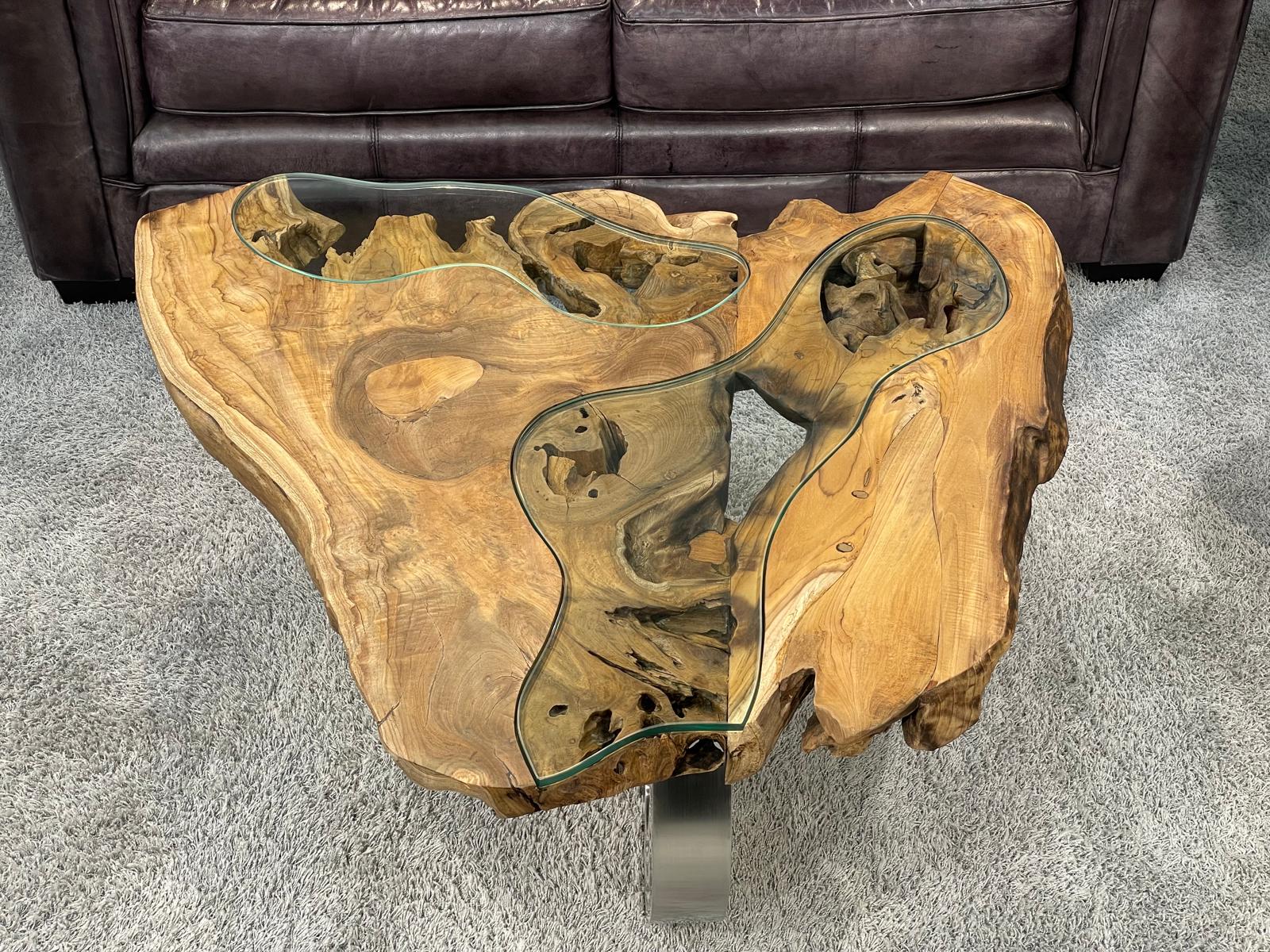 Material: Tree slice from the root area of the teak tree, glass, table legs in O-shape made of stainless steel