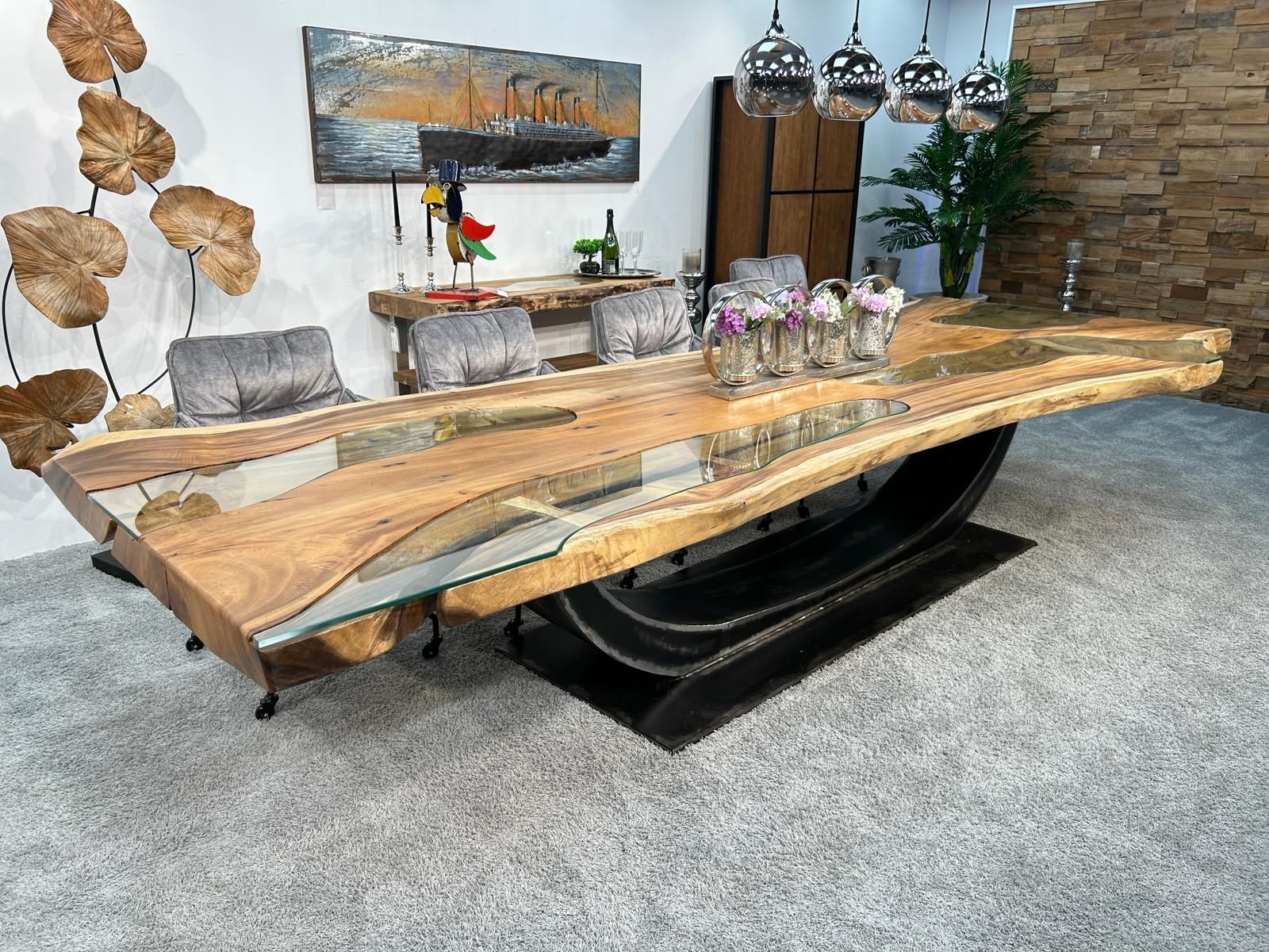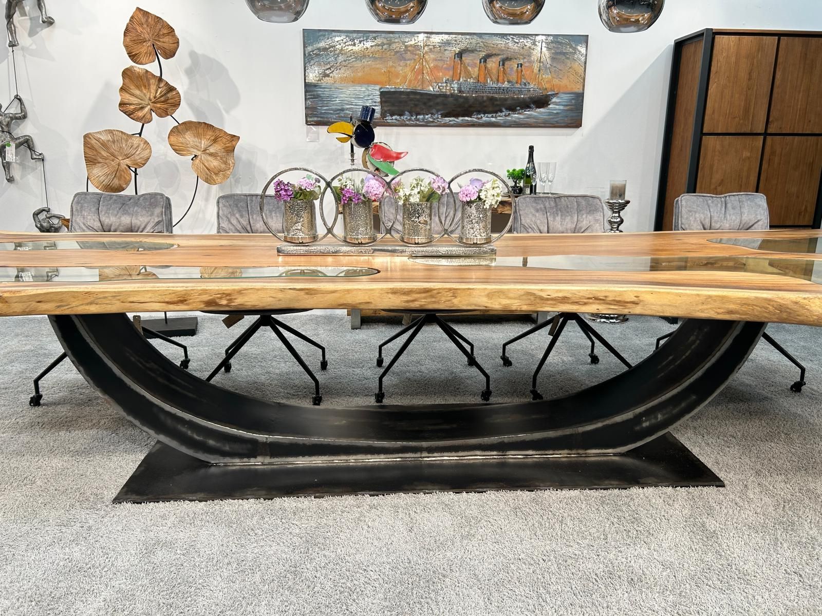 Large Conference Table / Dining Table made from a solid Suar wood slab, with an extra large (approx. 200 cm) crescent-shaped frame made of raw steel and glass inlays