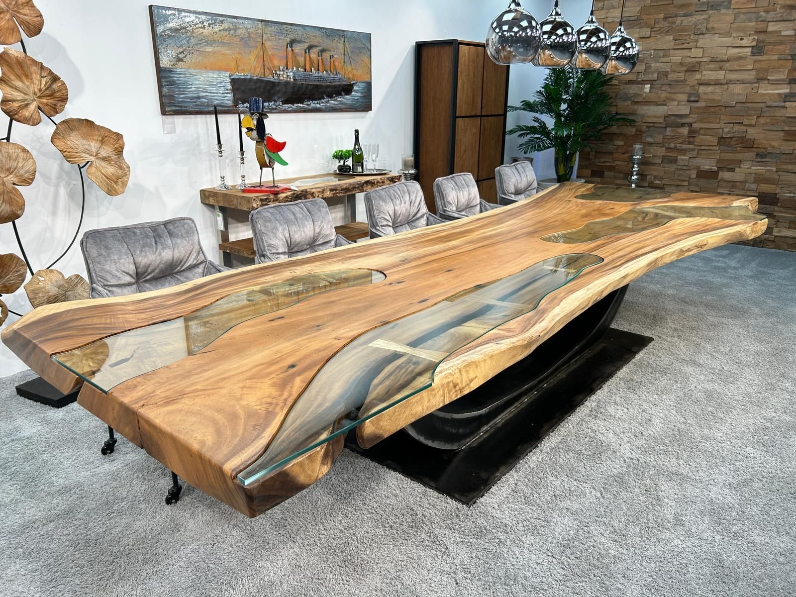 An incredibly beautiful example of a large conference table or dining table is this tree trunk table made from a single massive Suar wood slab. Suar is quite similar in structure and color to acacia and is therefore often offered under this trade name.