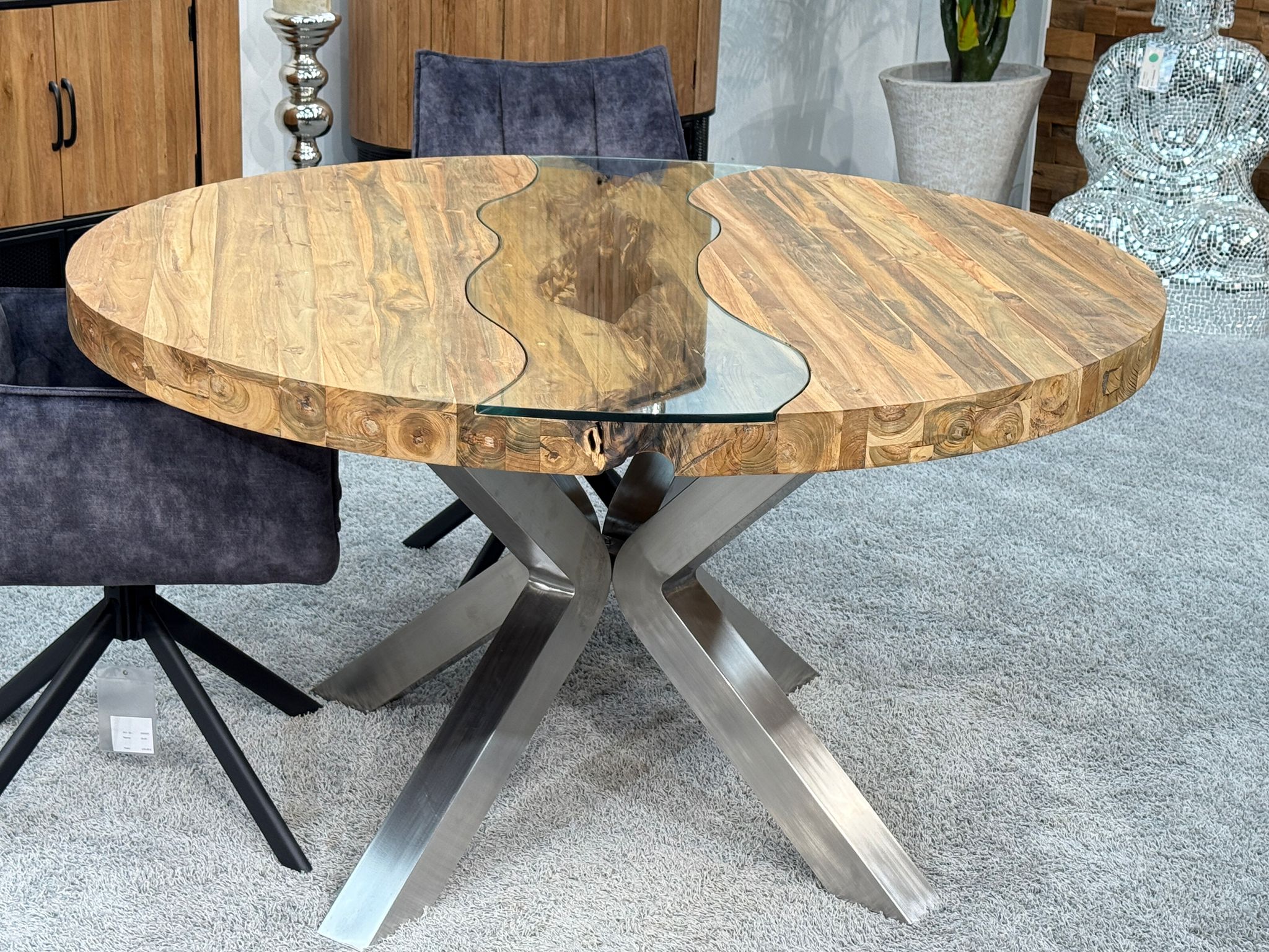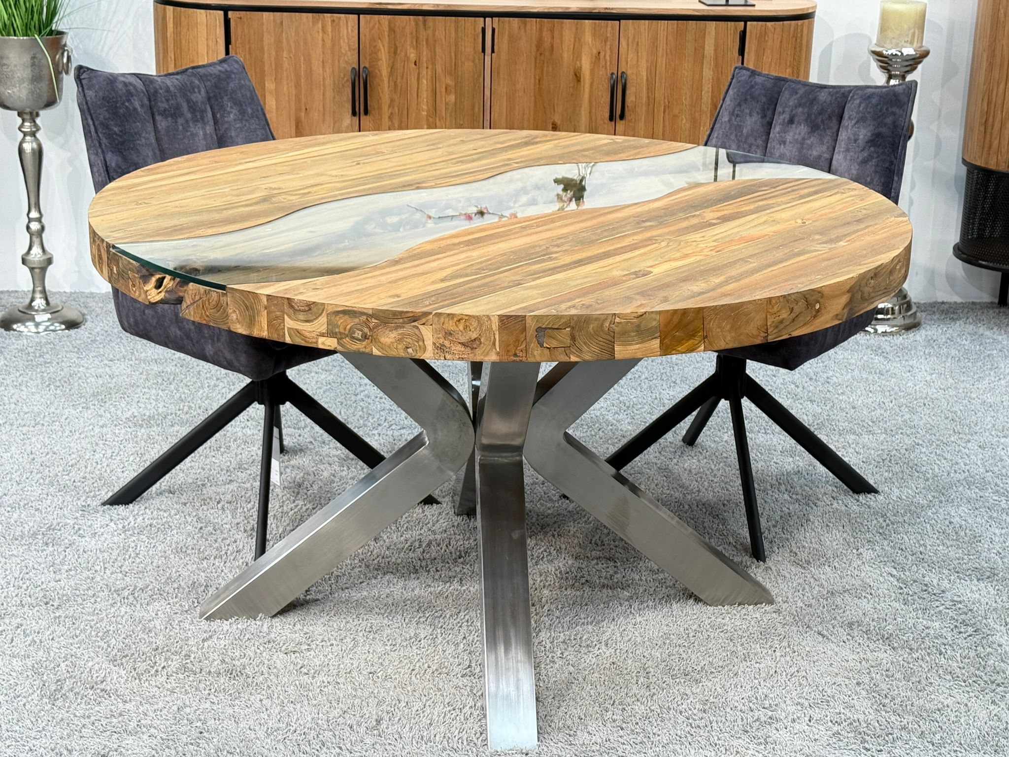 Find more dining tables from the "Eternia" series here: Dining table "Eternia"Experience the round wooden dining table "Eternia", an exclusive table from one of our furniture collections made from recycled wood. With an impressive diameter of 140 cm and a height of 78 cm, this dining table offers plenty of space for sociable gatherings with 6-7 people. The approximately 7 cm thick tabletop is not only solid but also a real eye-catcher thanks to its built-in glass inlay, which provides a view of the original wood underneath. The cross frame made of brushed stainless steel additionally ensures a modern look and excellent stability.